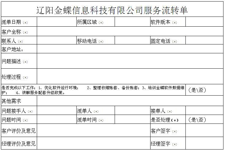 客户问题无法通过电话、远程解决的且客户在服务期内,应由服务经理出具服务流转单。服务流转单上记录着完整的客户信息、派单信息、服务记录、客户确认信息,服务交付完成客户确认后,由服务交付顾问带回公司存档,并将处理过程及结果提交到客户服务记录库,由服务经理对服务处理过程及结果进行回访。所有服务过程与结果都载入客户服务档案, 辽阳金蝶上门服务将客户已签字的服务确认单作为上门服务完成的依据。